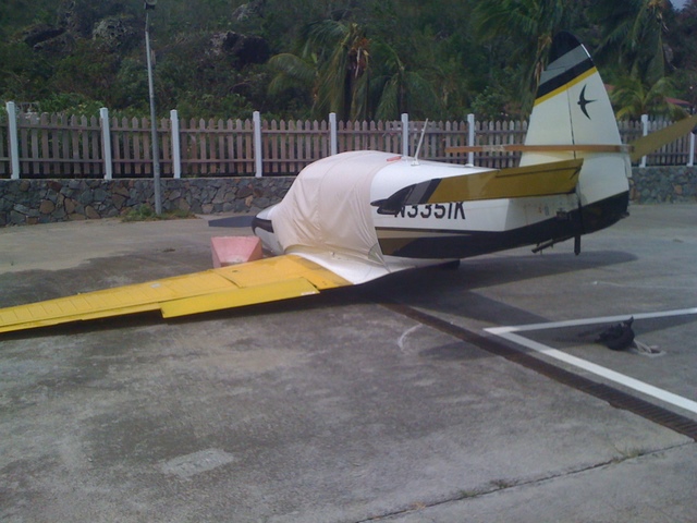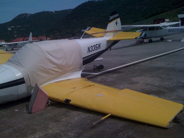 Last Summer, my Swift, N3351K was severely damaged in Hurricane Earl. Normally, my bird would not have been in St Barths, where I live during the winter months, during hurricane season. However, I still have some work in the islands over the summer months, and I generally commute from Nantucket to St Barth's in 51K. Why not! Weather prohibited my flight back unfortunately, and then life and work got unexpectedly busy back in Nantucket, and I had to delay returning to fly the plane back to ACK. When Earl developed in the eastern Atlantic, I watched it attentively, and then cancelled everything on my schedule and headed back to SBH when it looked like the storm might approach St. Barths. At the time, the probability was very low that the storm would develop or approach dangerously close to the island. However, as a career sailor, I never trust a hurricane. Back in SBH, I still had my boat, the boat that I captain, a Cherokee 6 I am a partner in and my Swift.