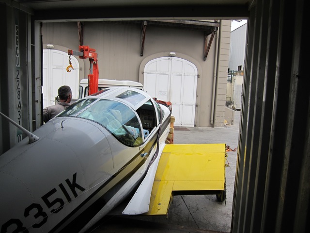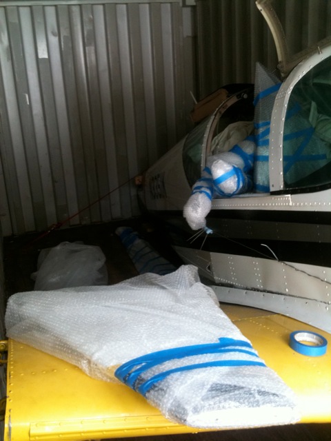 I built a frame to support the plane without one of the gear, and with the help of a good friend who has a Land Rover with a hydraulic crane, we picked her up, got her on the bed, and tucked into the container. Without one wing-panel or the empennage, a Swift fits very nicely in a 20' container!