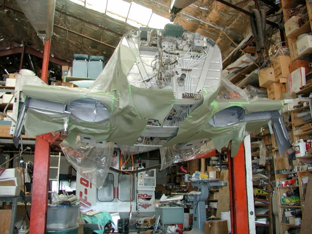 " It was found that the fuselage only needed relatively minor (by my standards) repairs, so it was stripped and repairs were made. The centersection was trashed so we installed a used, serviceable one I had here in Nevada. The horizontal was bent, so we rebuilt it. The vertical stab was corroded, so we built a new one. The wheelwells were stripped and painted. The gear and actuators were disassembled, cleaned, and painted and are currently going back together."