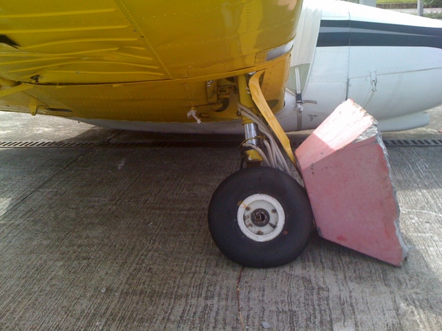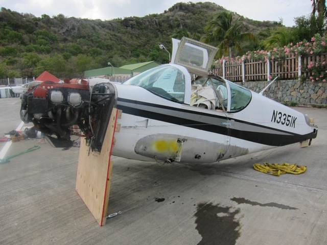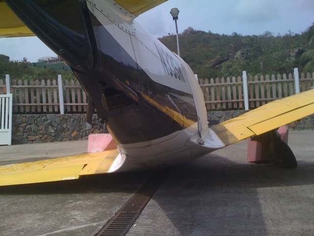 When I made it back to St. Barths, to skip forward, I had called ahead and discovered that my plane was "on the ground". I didn't ask for any details. As it turned out, during the storm, the winds were similar to what I had experienced on Corban, and the tail wheel has completely departed the aircraft, or rather, the aircraft had departed the tailwheel. The tailwheel was still securely tied down... At this point, things really went pear-shaped. The plane was secured at the jackpoints, at the prop, at the gear and at the tailwheel. When the tailwheel separated from the plane, she jeered and jerked and tried turning and twisting with ever big gust. Finally one starboard gear collapsed, and things really went south.
