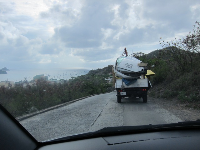 I rode the storm out at sea, never making it to Guadeloupe. The storm had intensified so fast and to the south, the conditions were impossible to continue sailing south, and I had to run out to sea. I wound up about 60nm or so out in the atlantic east of Antigua before I could turn the boat around and start heading back in the direction of St. Barths. Corban, a stalwart Swan 42, suffered minor damage considering the conditions we had just sailed through, but I was not so optimistic for my Swift... However, I had left her in a as good a spot as possible with the wings sandbagged, and tied down as securely as possible.