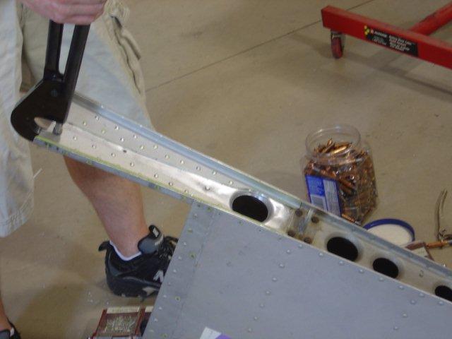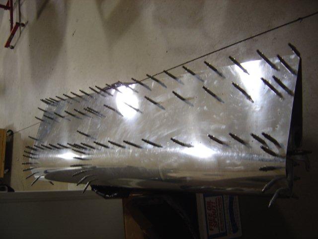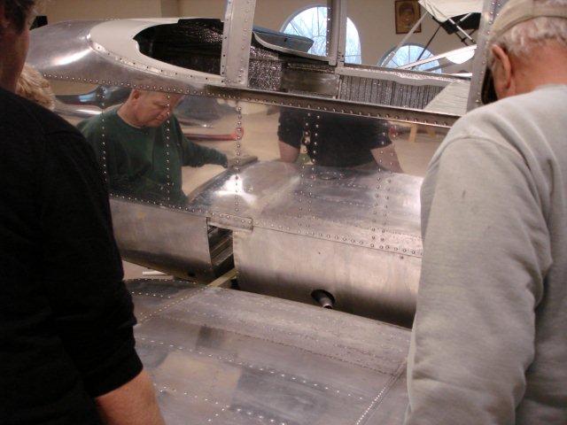 We had to repair the horizontal stabilizer rear attach fitting that was discovered with broken/loose rivets. Next we installed the "Swift" vertical fin beef-up kit. Barb made the Balun installed inside the vertical stabilizer for the VOR antenna. The tail sections then went on without a hitch. Since the fuselage, center section, and horizontal stabilizer were not from the original airframe, the tail and wing root fairing holes did not line up perfectly, requiring a lot of rivnut replacements. That required installing and removing the fairings so many times we lost count and wore out lots of screws.