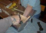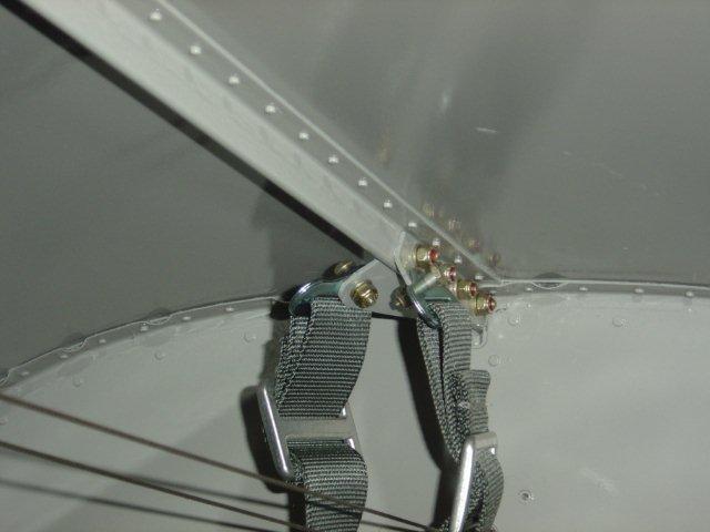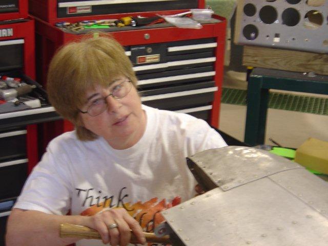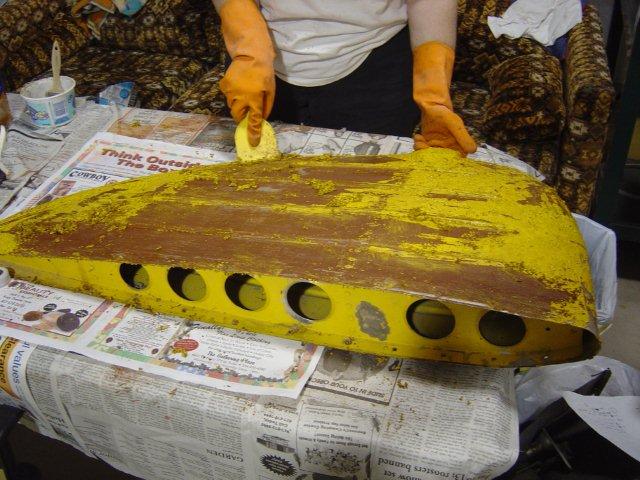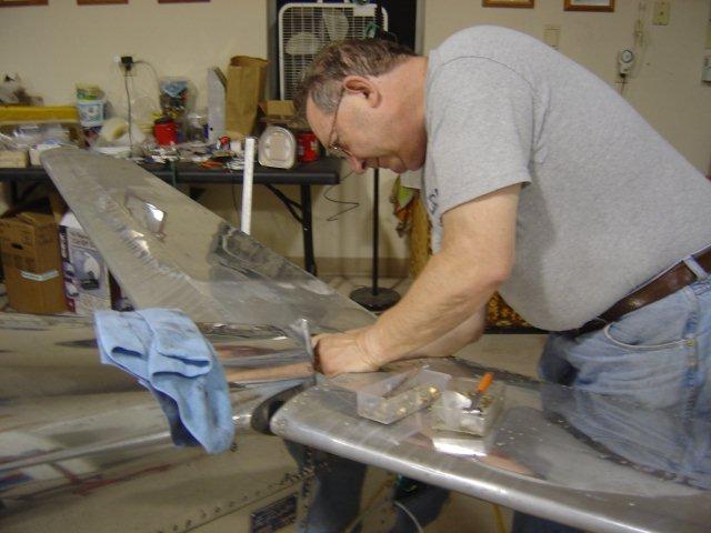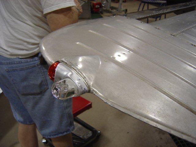 Before the wings could be attached, we first had to install the gross weight increase from Merlyn. While the airframe was apart we replaced all the control surface bearings with new. We installed a blade type heated pitot along with the static ports in accordance with the "Luscombe Letter." The wings with ailerons attached, went on without a hitch. The wing tips on the other hand, needed a lot of work. The left tip was the original off this airplane; however, the right tip was one rescued by Joe Ranson from the scrap pile. Thanks to Pat Moore and his home made tools, Barb was able to get most of the dents out, and they now look quite respectable.
