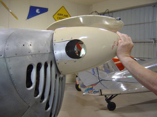 The engine baffling and cowling installation took more time than any other single item we did on the airplane. We had some help with the baffling and it took a full four days to complete. The installation of the cowling is almost too hard to talk about. There are 52 screws in the cowling. I can't tell you how many times we had the cowling on and off 'til we got it to fit properly. We did trim the cowling for the governor control arm and made new attach brackets. The spinner is the McCauley 4101 spinner called out in the STC (found one from Vaughn Armstrong); however, the STC does not mention that it requires the backing plate be reversed and about 3/4" removed from the rear of the spinner to work with the stock cowling. Although hard to find, not to mention expensive, this is the spinner to have with a McCauley C67 prop! It fairs very well into the stock cowling. We stripped the paint and primer off and tried unsuccessfully to polish the spinner. Believe it or not, Easy Off oven cleaner will remove anodizing from aluminum and then it will polish.